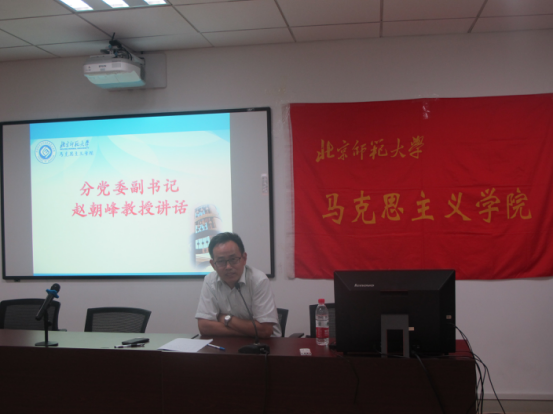 接着,分党委副书记赵朝峰老师讲话。赵老师要求同学们树立“五个意识”。第一是政治意识,赵老师强调,马院的员工要有超出一般学科的人文关怀和社会关怀,“讲政治”是“讲最大的道理”。第二是纪律意识,赵老师希望同学们认真阅读校规校纪,党员同学还应该研读党规党纪,注意行为底线,谨言慎行。第三是学习意识,他以“敏而好学”引入,指出“敏“是观察问题的敏锐度,代表智商;“好学”是一种态度,代表情商。兼具敏锐和好学的人,才会成为不可替代的人才。北师大和北京有很多的学术资源,同学们应当学会利用,同时还应该多关注社会现实,不要让自己将来后悔。第四是能力意识,他提出,知识不能改变命运,运用知识才能改变命运。失败不是成功之母,反思失败才是成功之母。同学们要通过多关注社会现实、多参加员工工作、实习实践把知识转化为能力,促进自身更好地发展。第五是修养意识。他说,大家要学会和同学、和老师们相处,增强理解,学会包容,加深修养。最后,赵老师也希望同学们积极向老师们反馈问题和困难,承诺公司一定会全力帮助大家解决。赵老师在讲话中引经据典,用幽默直白的语言阐述了深刻的道理,令同学们收获颇丰。