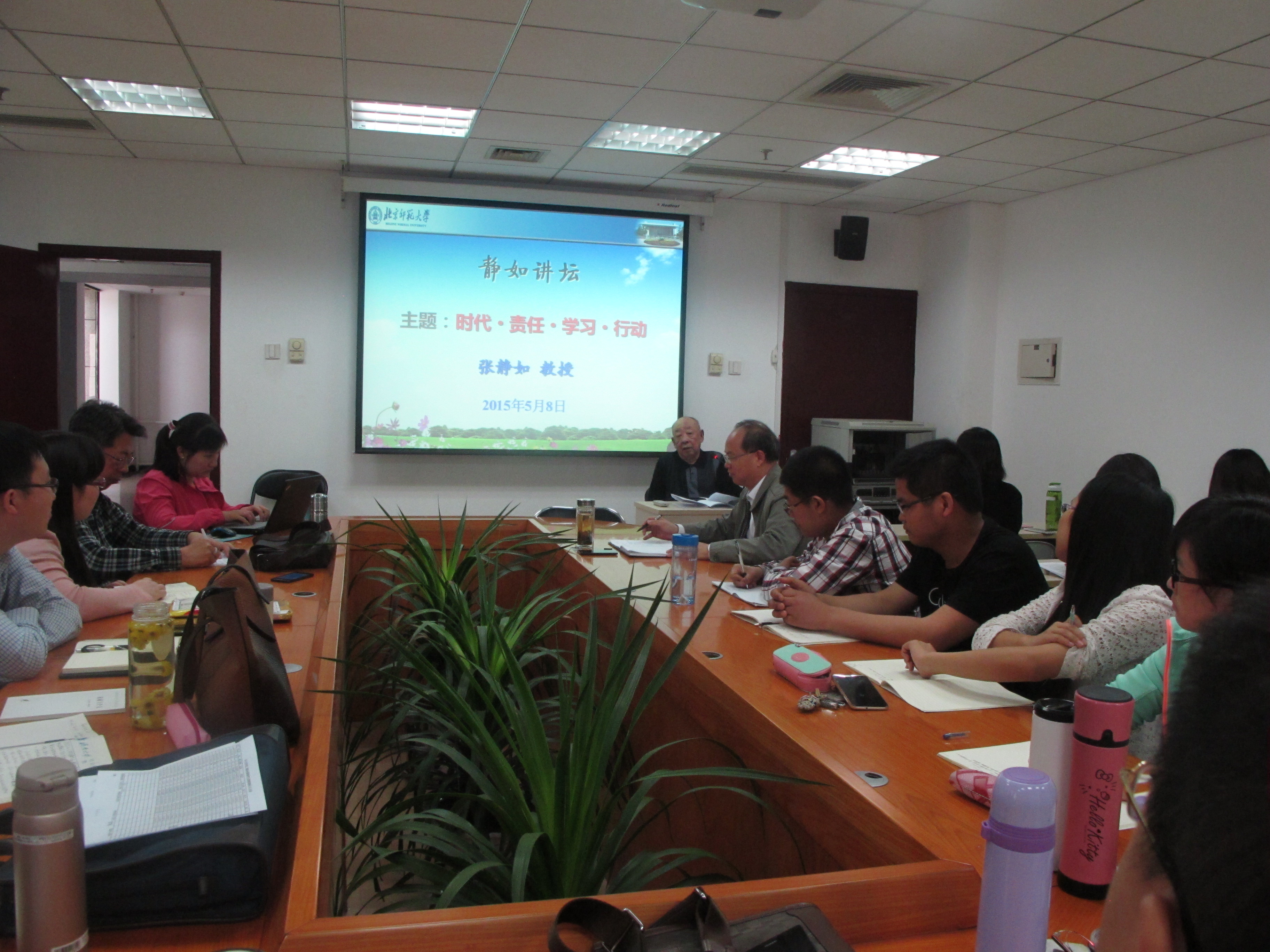 5月8日(周五)上午,“静如讲坛”专家讲座在前主楼B区401会议室开坛。本次讲座的主题为时代·责任·学习·行动——谈研究生的学习和生活,主讲人为beat365亚洲体育官方网站教授张静如先生,讲座由beat365亚洲体育官方网站经理王树荫教授主持,公司党史党建研究所师生及公司内外其他专业的研究生聆听了讲座。