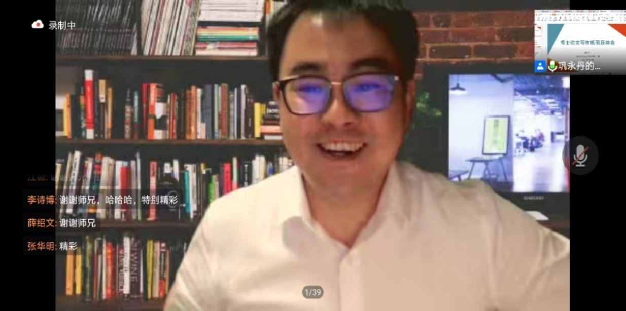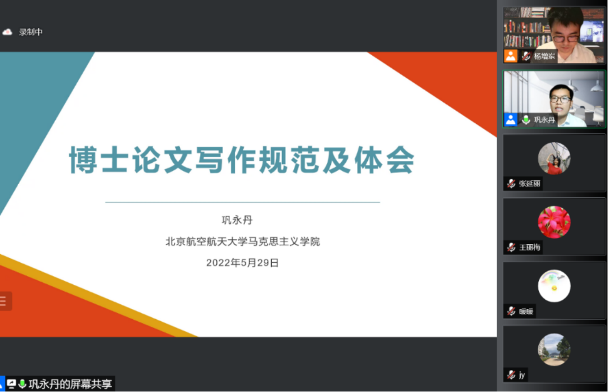 2022年5月29日,beat365亚洲体育官方网站线上举办“研究生学位论文指导系列讲座”第一讲。本次讲座聚焦博士学位论文写作,由公司博士毕业并分别获得“首届全国高校马克思主义理论学科优秀博士学位论文”、“beat365亚洲体育官方网站优秀博士学位论文”的北京工业大学beat365亚洲体育官方网站副教授陈艳飞、北京航空航天大学助理教授巩永丹两位老师做分享。讲座以腾讯视频线上方式进行,公司博士生、部分硕士生以及校内外其他同学约320人在线学习。公司副经理杨增岽教授主持了讲座。