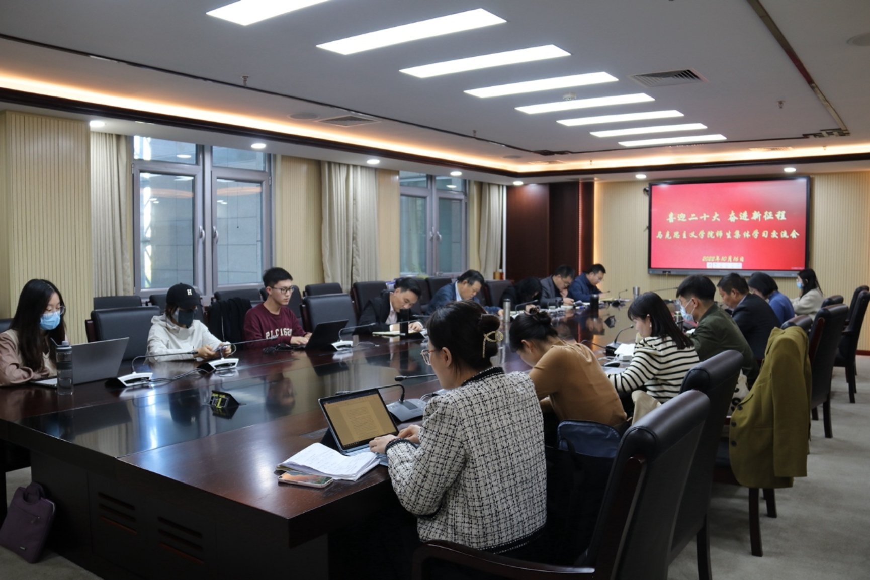 副经理杨增岽老师认为,党的二十大报告逻辑清晰,遵循从历史、现实、到未来的线索,在报告的主题中,突出了伟大建党精神的重要性。副经理刘洪森老师表示,大会报告主题明、领域广、内容实、语言活,要更加紧密团结在以习近平同志为核心的党中央周围,继续谱写新时代中国特色社会主义更加绚丽的华章。党委副书记高超老师表示,习近平总书记是党和国家事业发展的领航掌舵人,维护党中央权威和集中统一领导,是关乎党和国家前途命运的原则性问题。冯留建老师就大会报告中有关科教兴国战略的部分内容,交流了自己的学习感悟,认为我国应在党的领导下,加快建设世界重要的人才高地。李娟老师深入学习了大会报告提出的中国式现代化的具体路径,表示后续要把二十大报告内容转化为学术研究和教学实践成果。王天民老师就大会报告中提出的坚持马克思主义在意识形态领域的指导地位、中国式现代化的独特性等内容,表达了自己的学习体会。邢国忠老师表示,自己在学习了大会报告后深化了对新时代的理解,特别是震撼于过去十年国家发生的翻天覆地的变化。